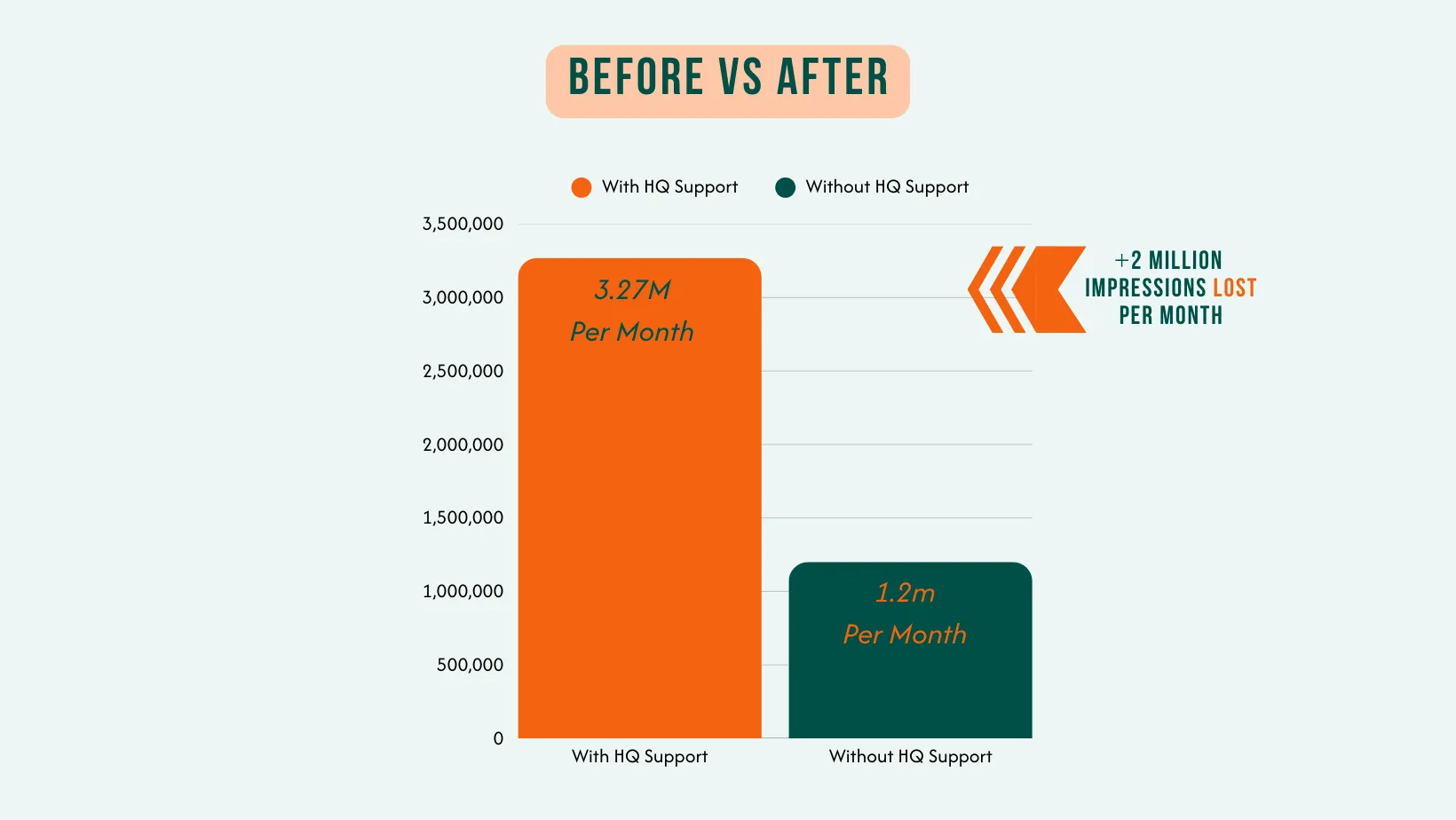 Without support from HQ, that number dropped to around 1.2 million per month.That’s roughly two million impressions disappearing every month.